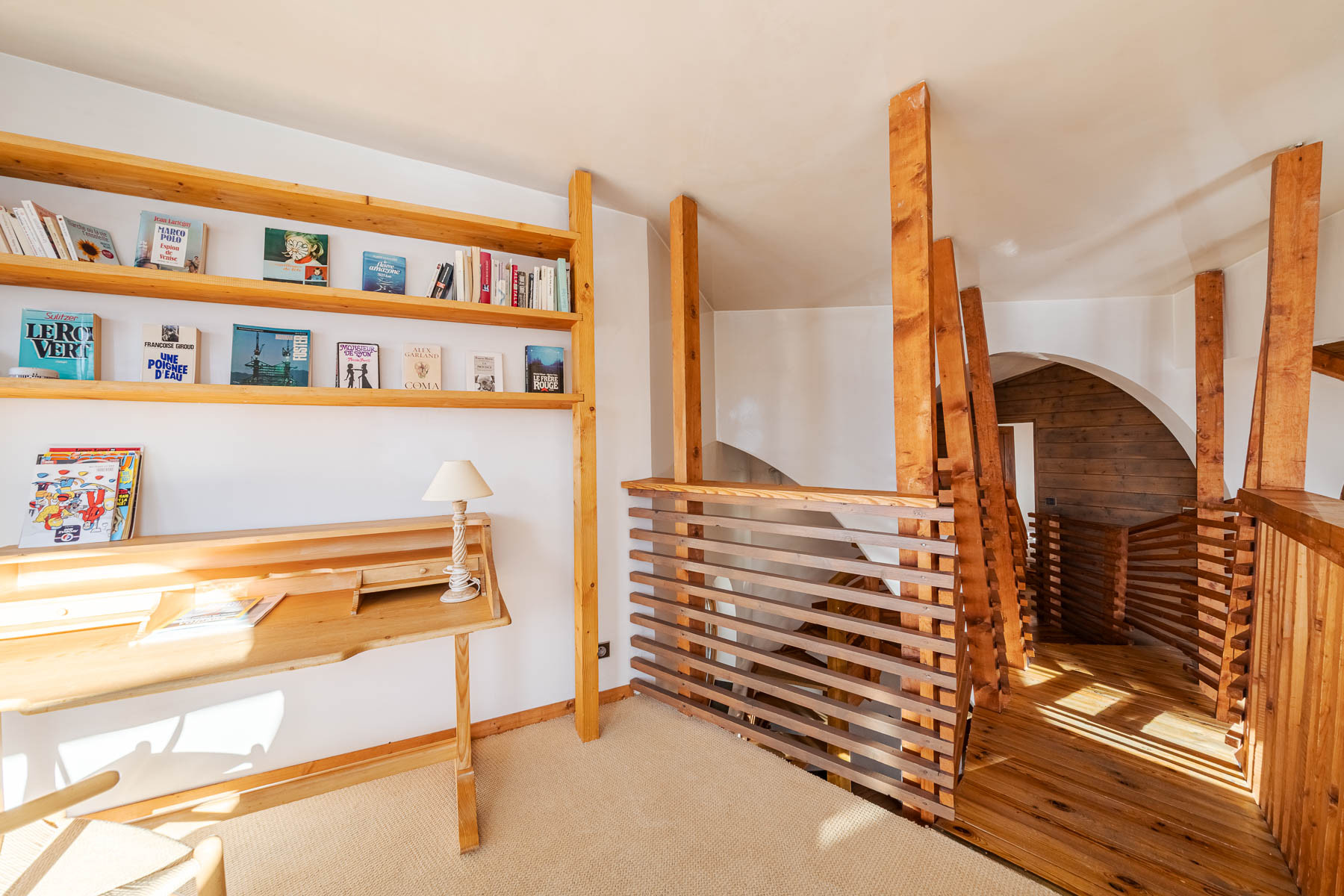 - Depuis la master nous avons accès via un pont suspendu à un nouveau salon/bureau composé d'un canapé, d'un bureau et de sa bibliothèque et une vue magnifique sur les Ardoisières.