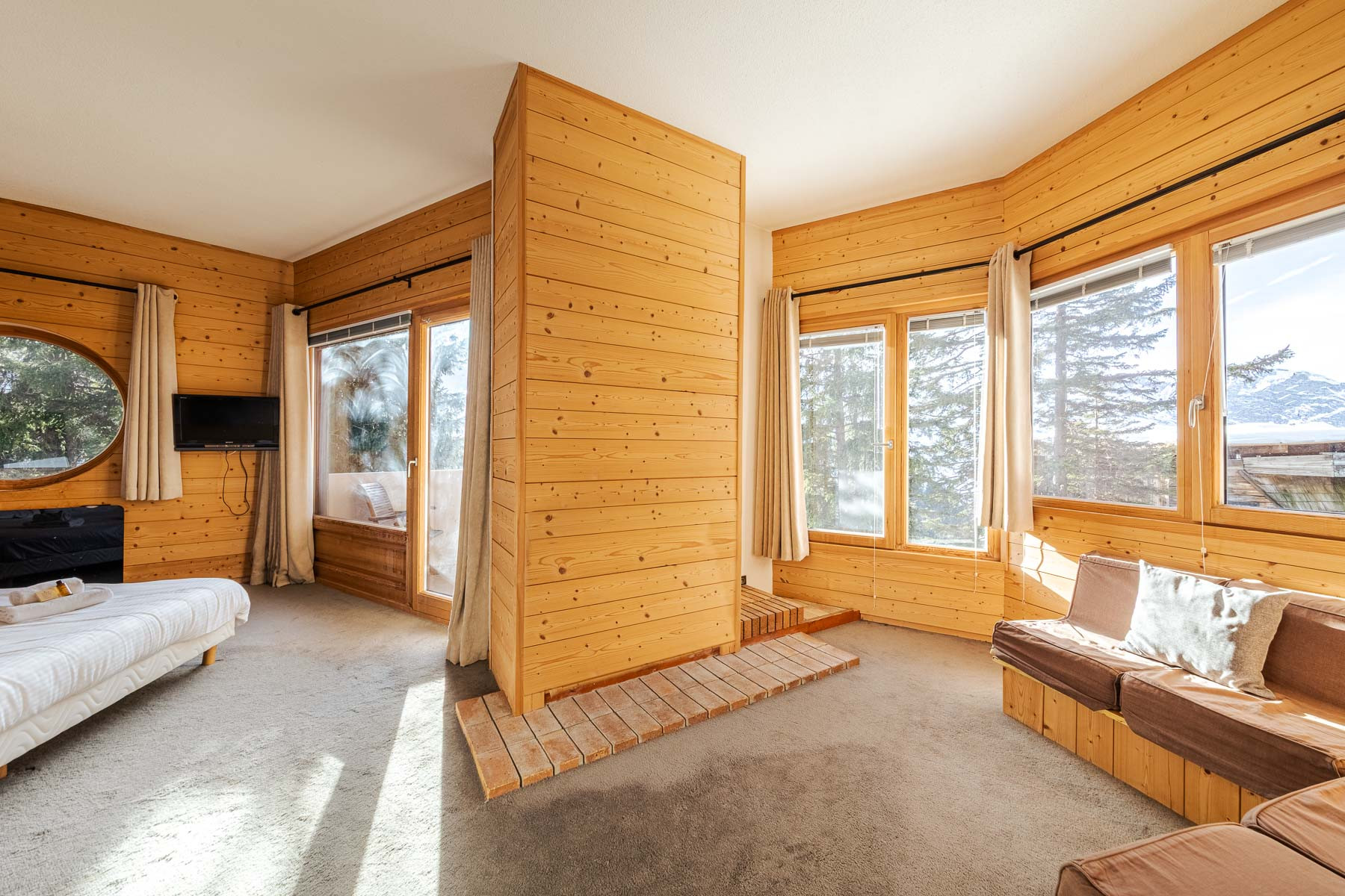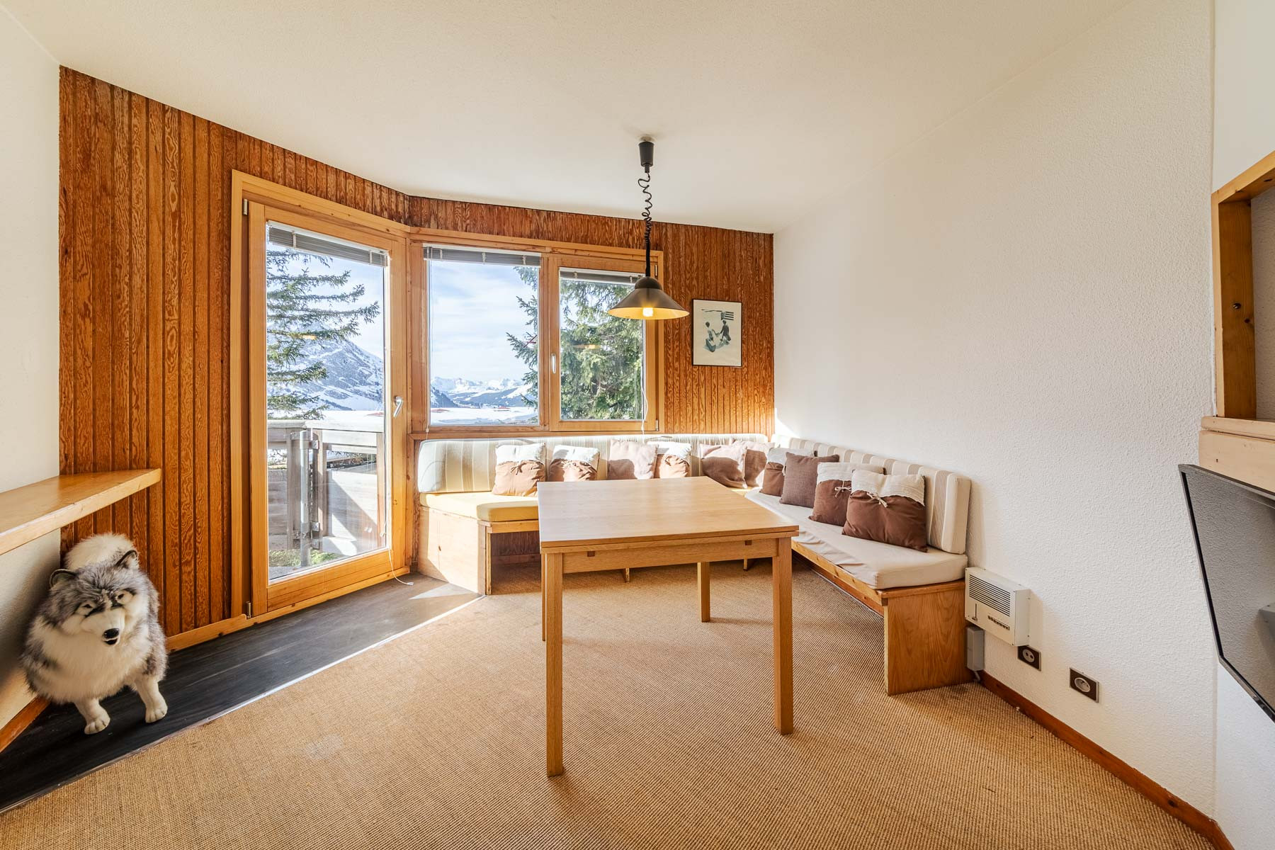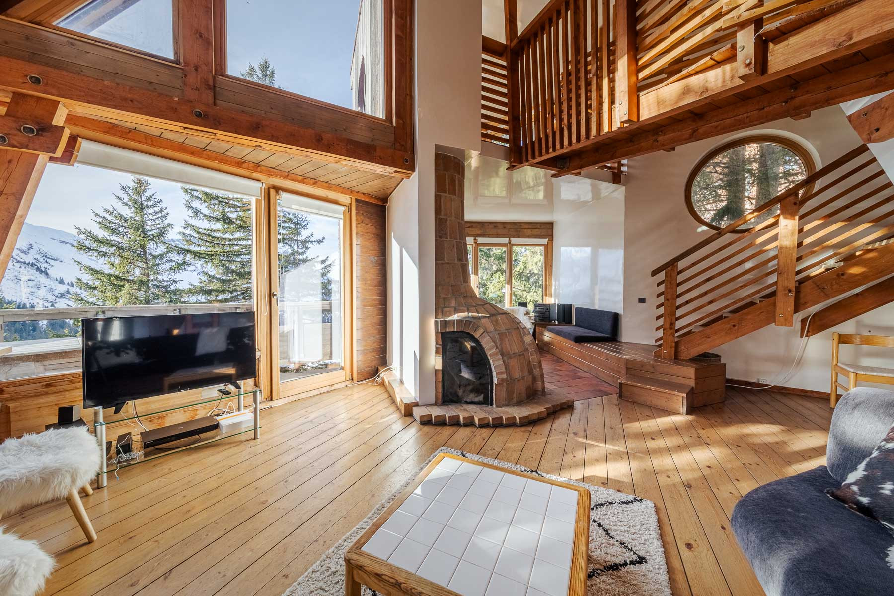 - Quelques marches mènent à droite à un agréable coin lecture avec magnifique vue sur la vallée des ardoisières et cheminée à foyer ouvert. Sur la gauche on retrouve l'espace salon en double hauteur avec une magnifique charpente apparente typique de l'architecture Avoriazienne de M. Jacques Labro. Une banquette en angle permet de nombreuses assises pour profiter de la vue sur les hauts-forts et le secteur arare. Un balcon est accessible depuis le salon.