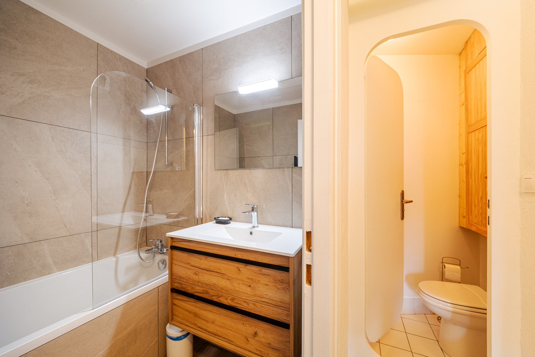 - On the right, we find the water rooms with a washing machine, an independent WC and a fully renovated bathroom with vanity unit, mirror and bathtub.
