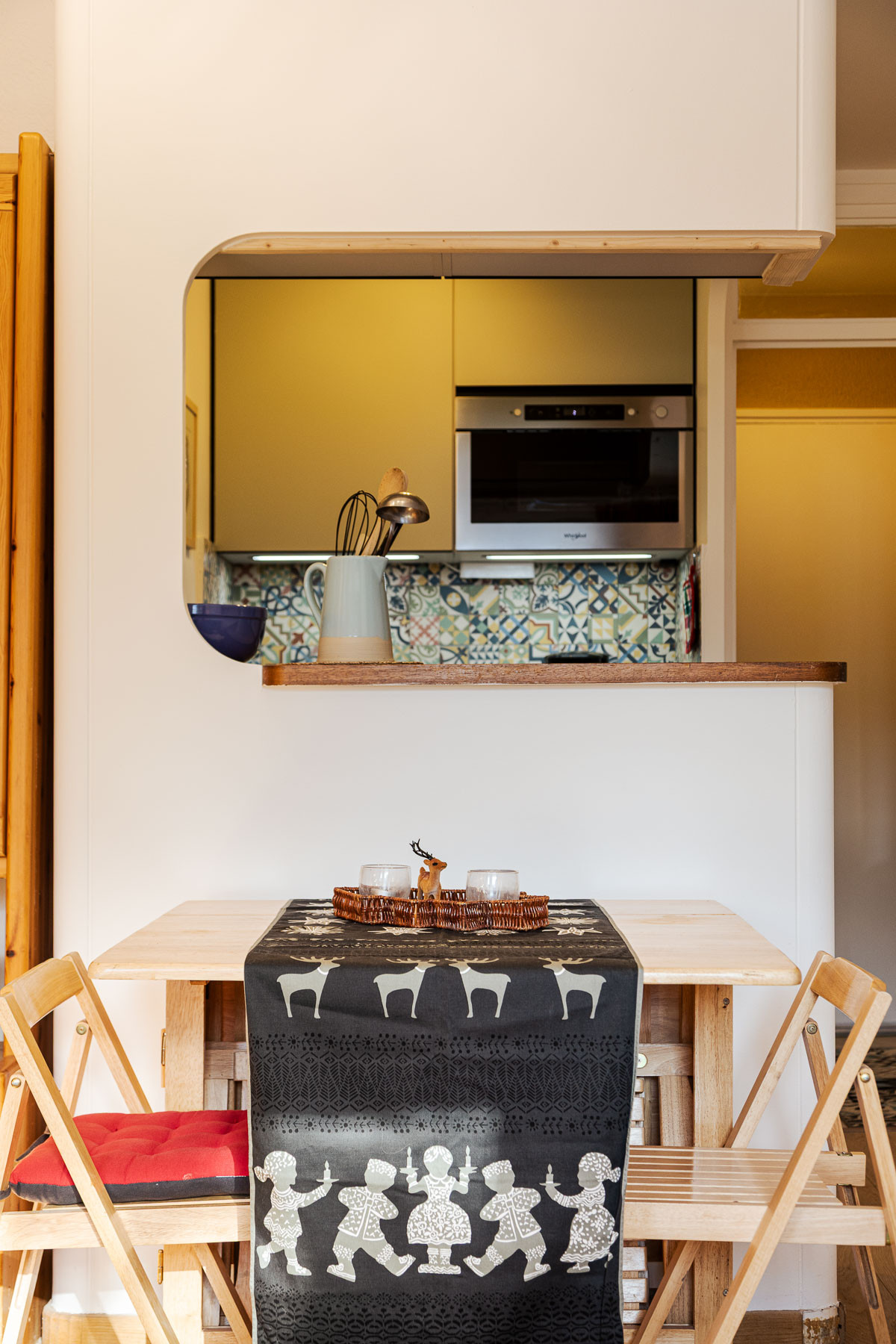 - A corridor leads to the right to the renovated and fully equipped kitchen opening onto a pleasant living space with dining table, simple bench serving as a 190x80cm bed and a trundle bed underneath (190x80cm). A balcony is accessible from the living space.