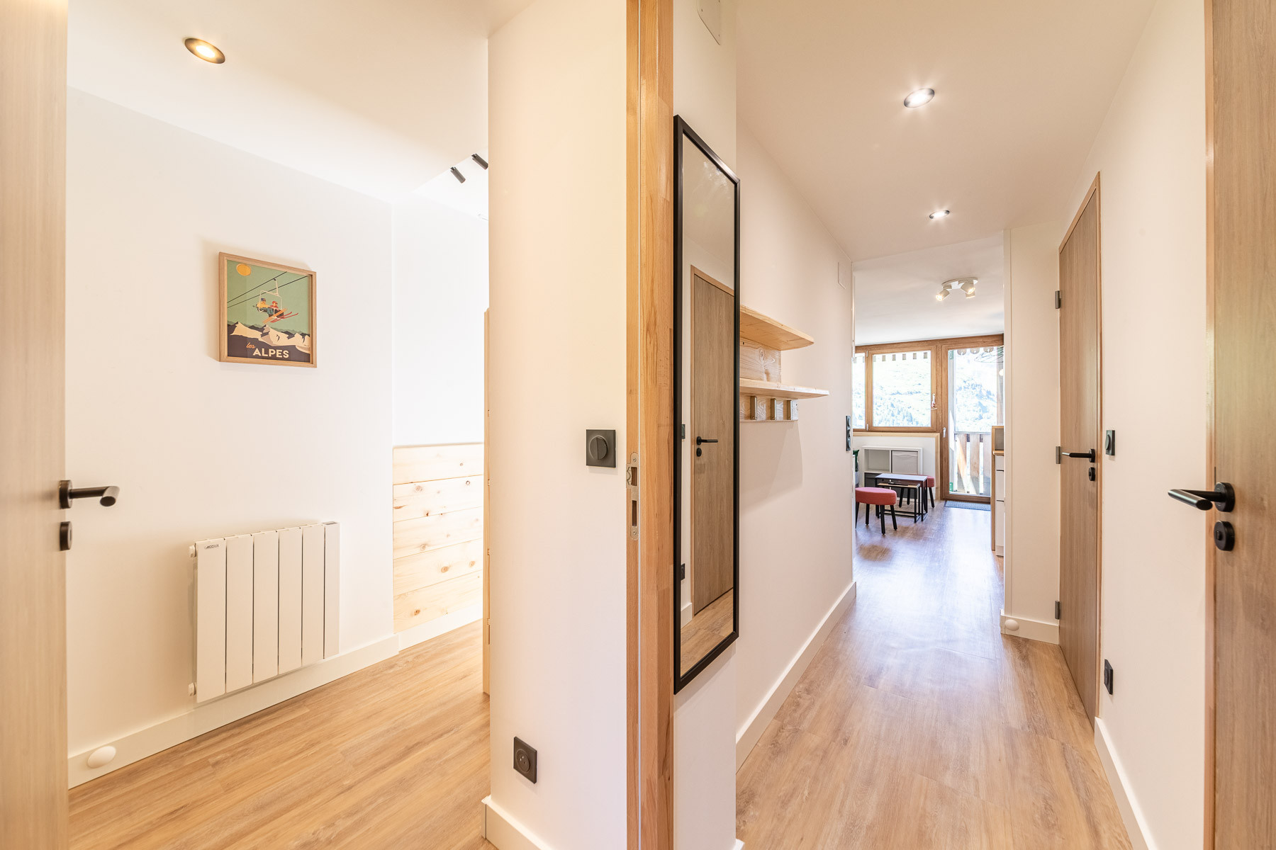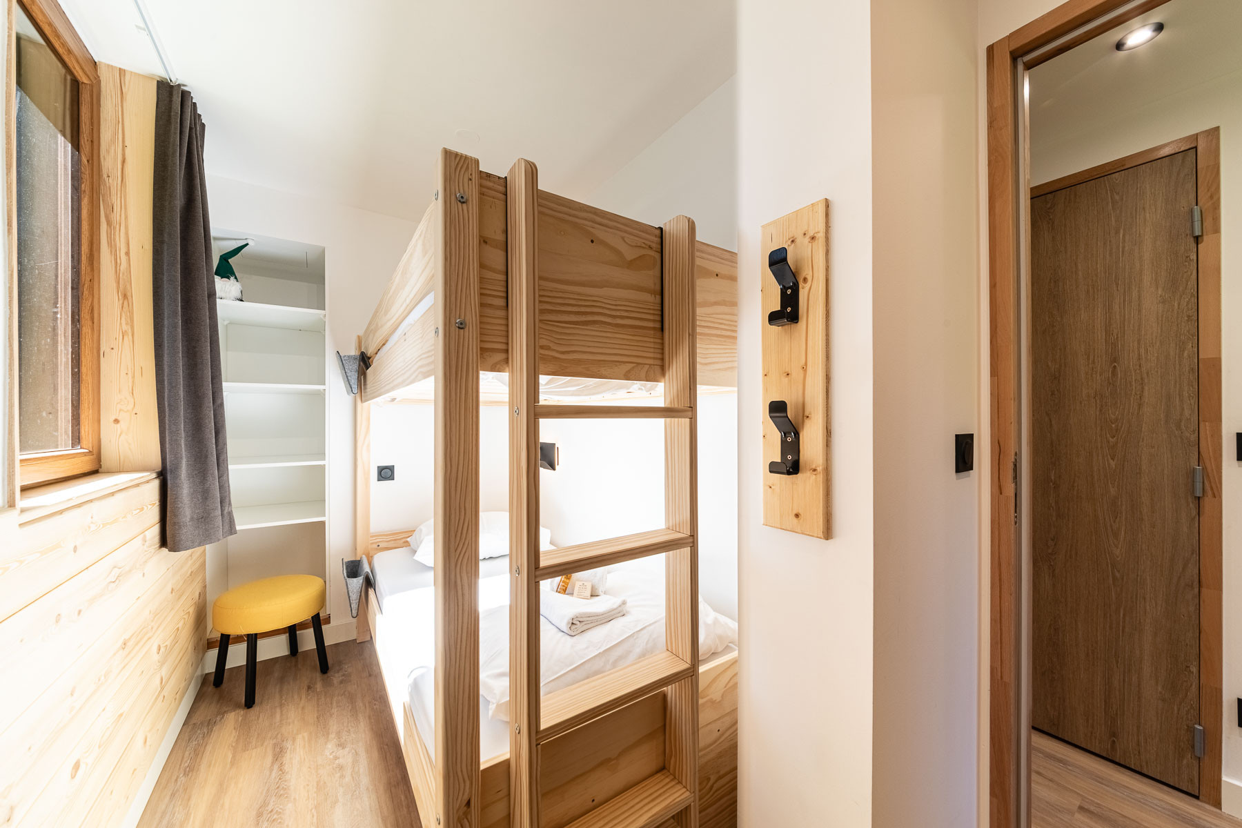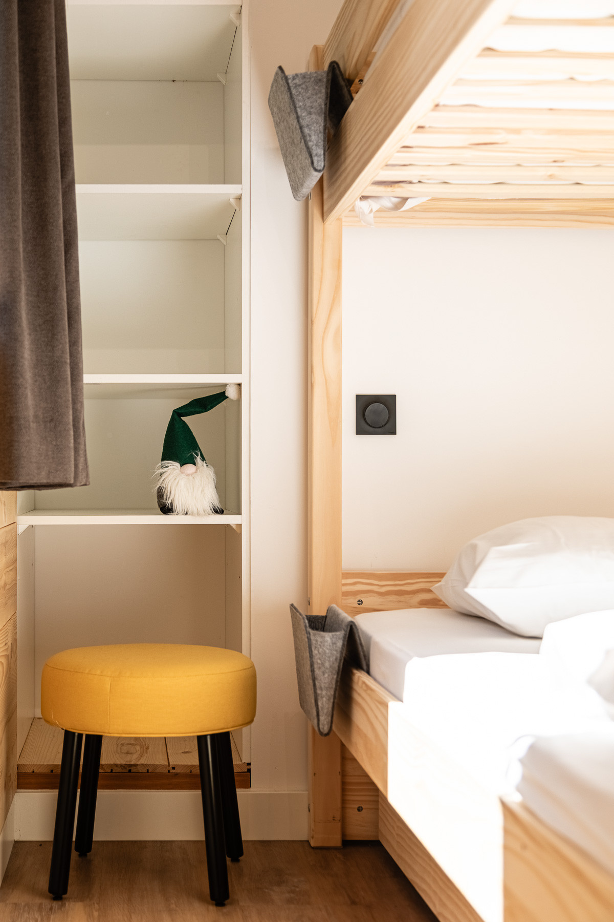 - Pleasant entrance with an electric shoe dryer, serving a first bedroom equipped with 2 bunk beds (80 x 200) with its storage spaces