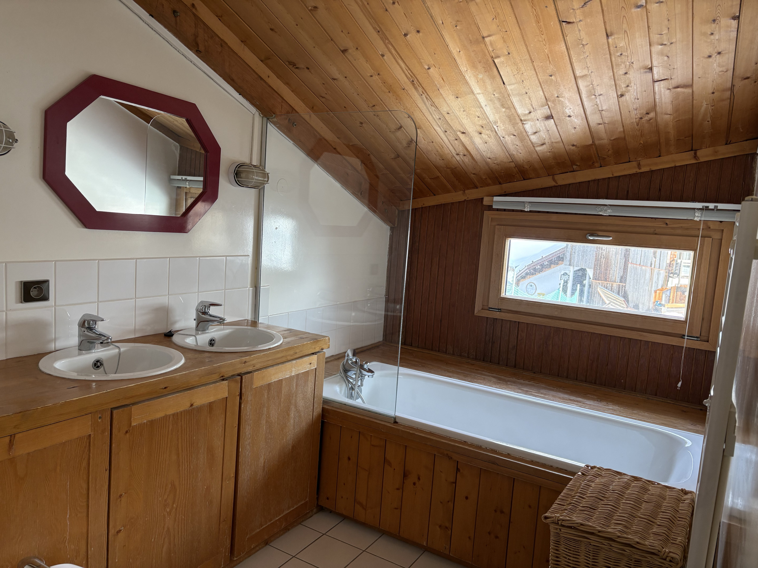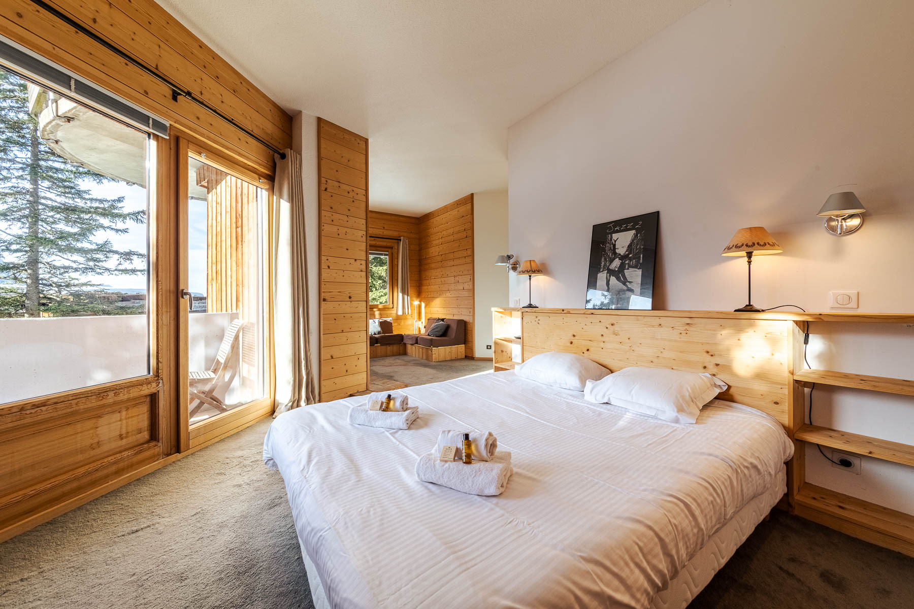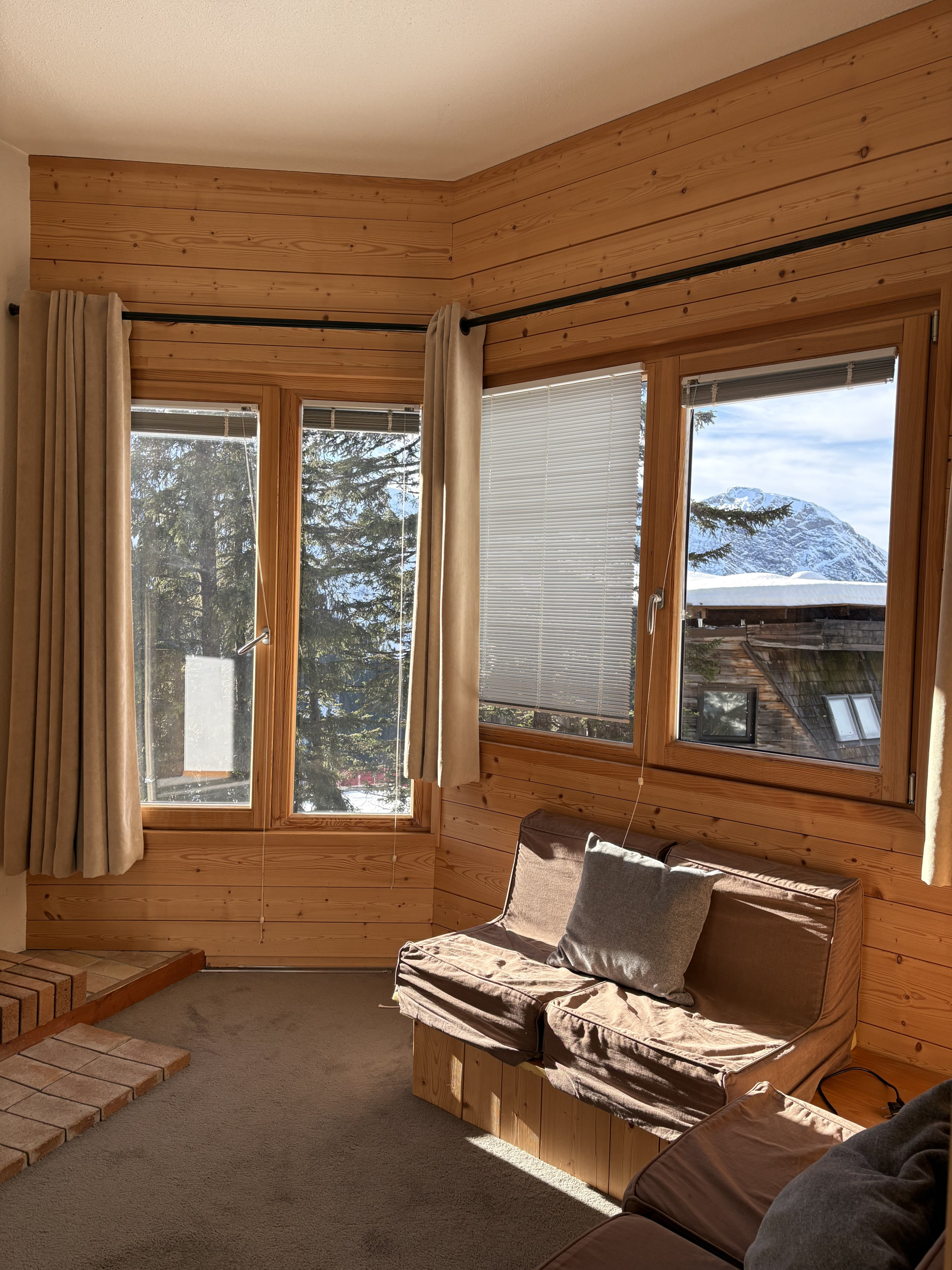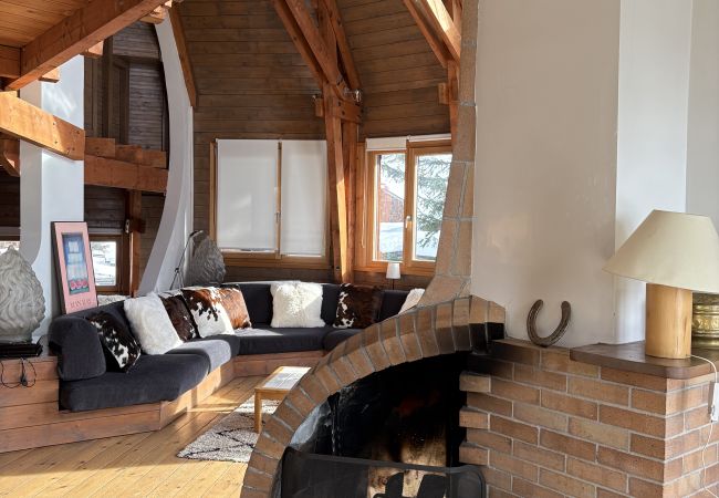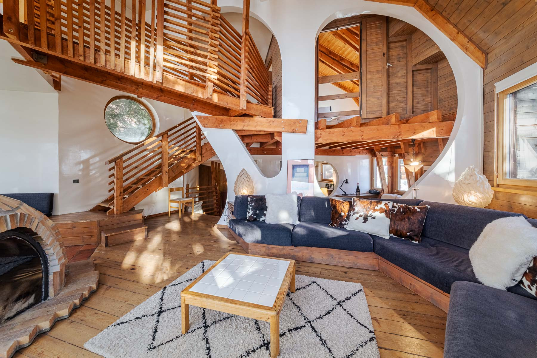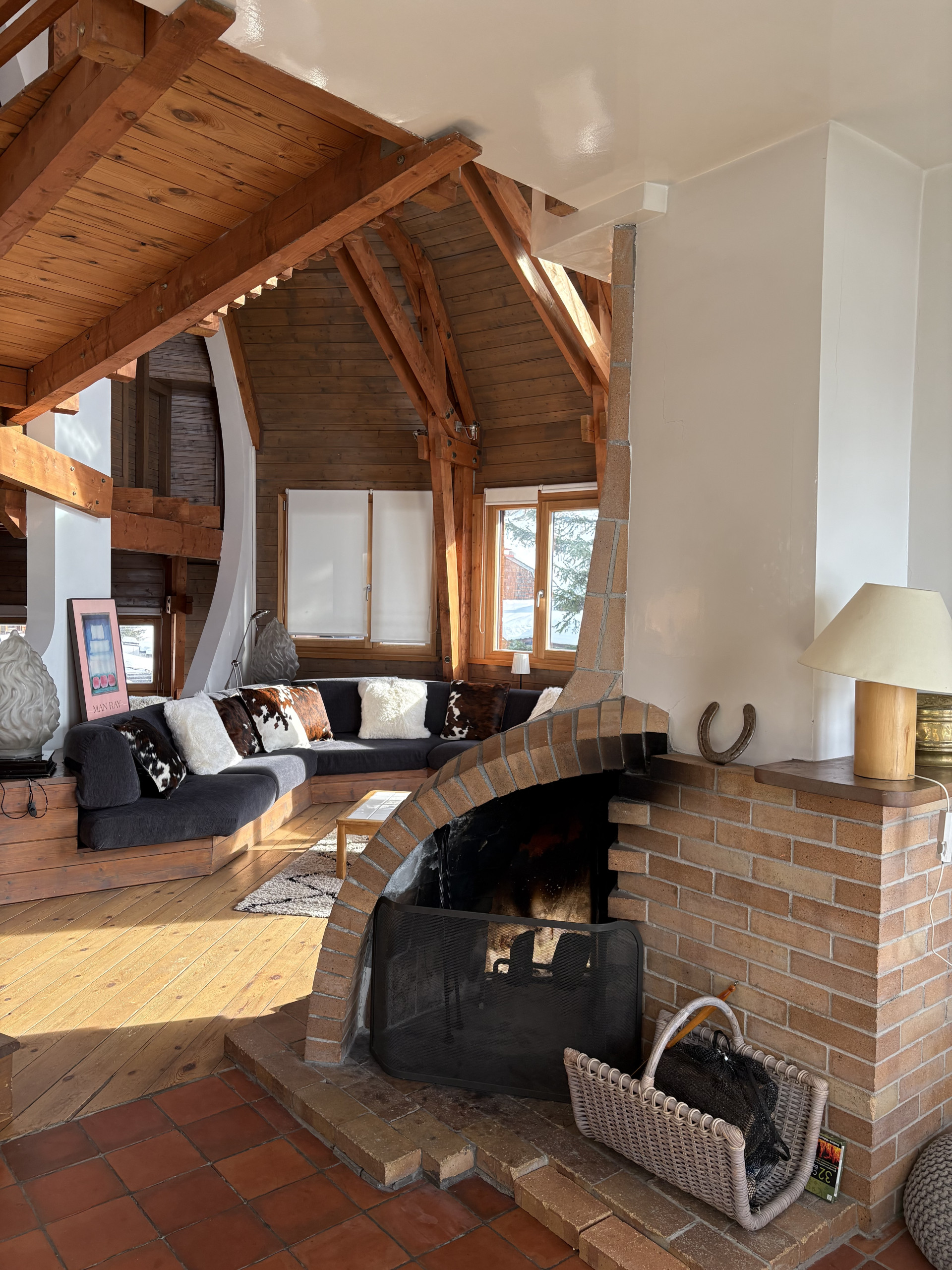- A few steps to the right lead to a pleasant reading corner with a magnificent view of the slate valley and an open fireplace. On the left, you'll find the living room area with double height and a magnificent exposed timber frame typical of the Avoriaz architecture by Mr. Jacques Labro. An angled bench provides numerous seating options to enjoy the view of the high forts and the Arare sector. A balcony is accessible from the living room.