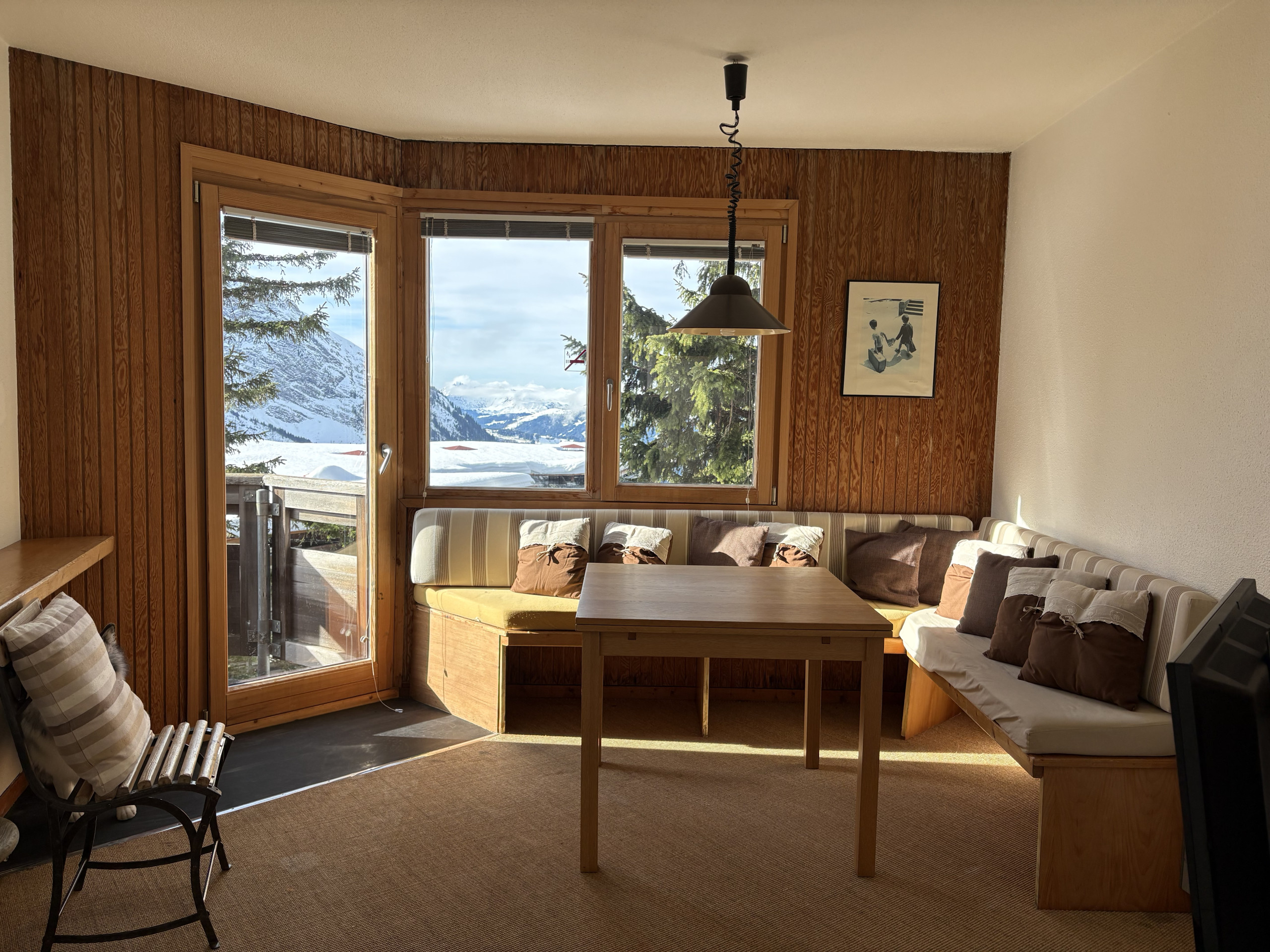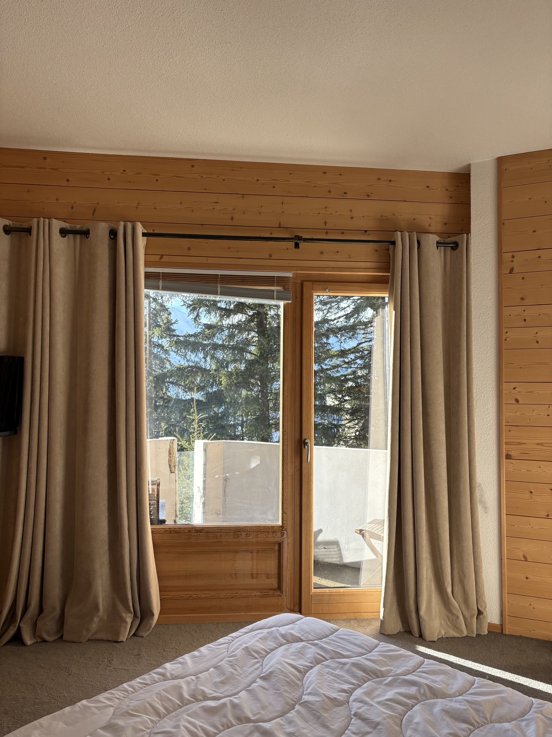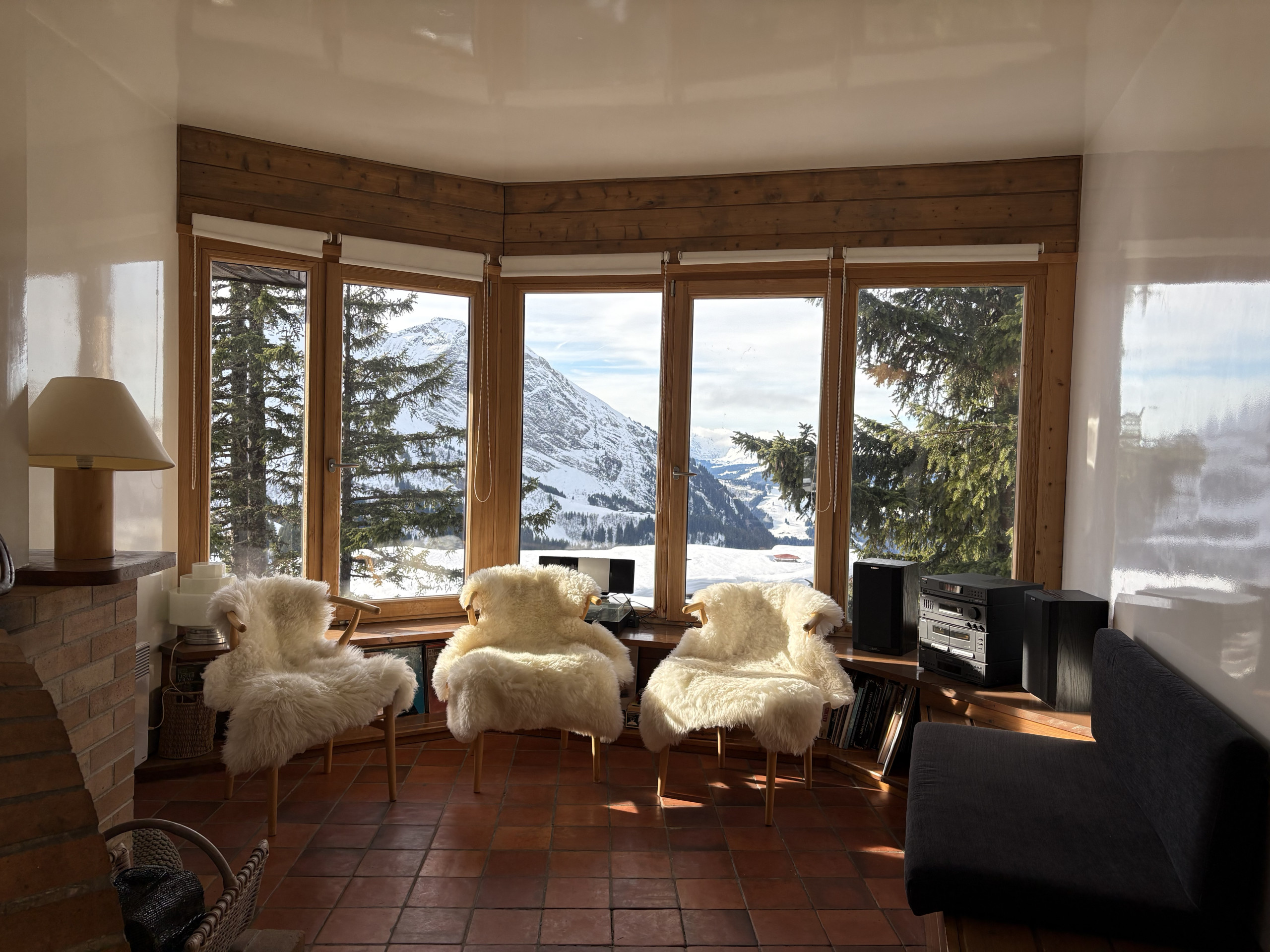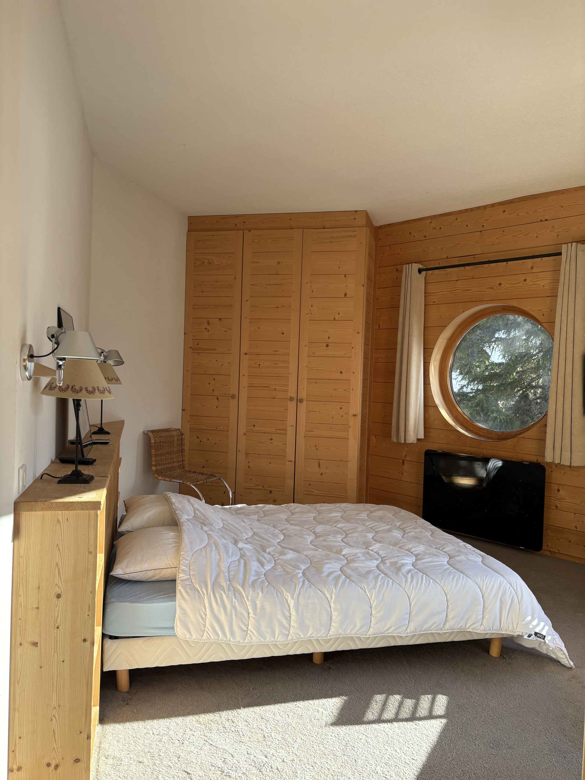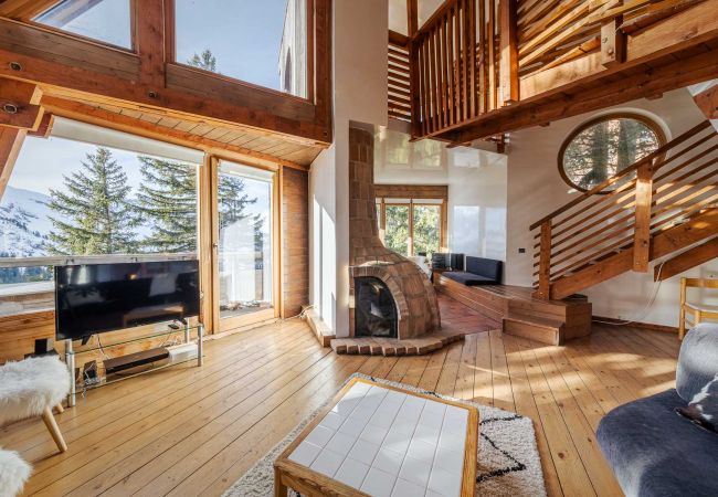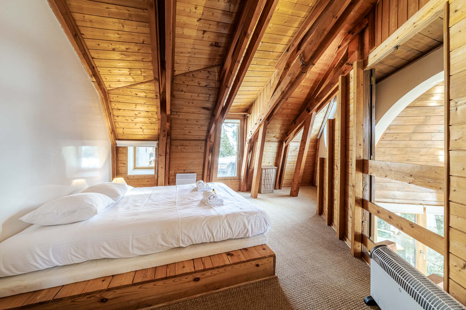 - A few steps to the right lead to a pleasant reading corner with a magnificent view of the slate valley and an open fireplace. On the left, you'll find the living room area with double height and a magnificent exposed timber frame typical of the Avoriaz architecture by Mr. Jacques Labro. An angled bench provides numerous seating options to enjoy the view of the high forts and the Arare sector. A balcony is accessible from the living room.