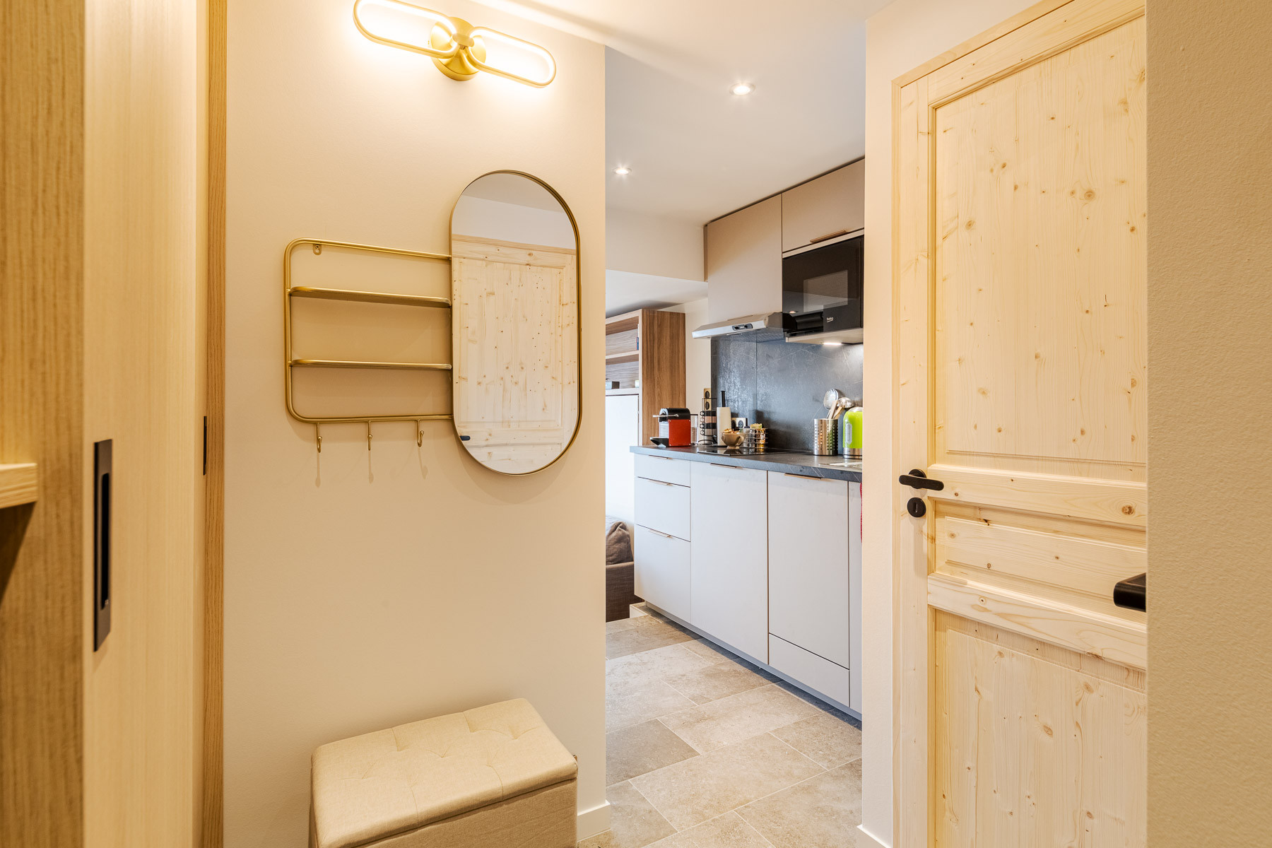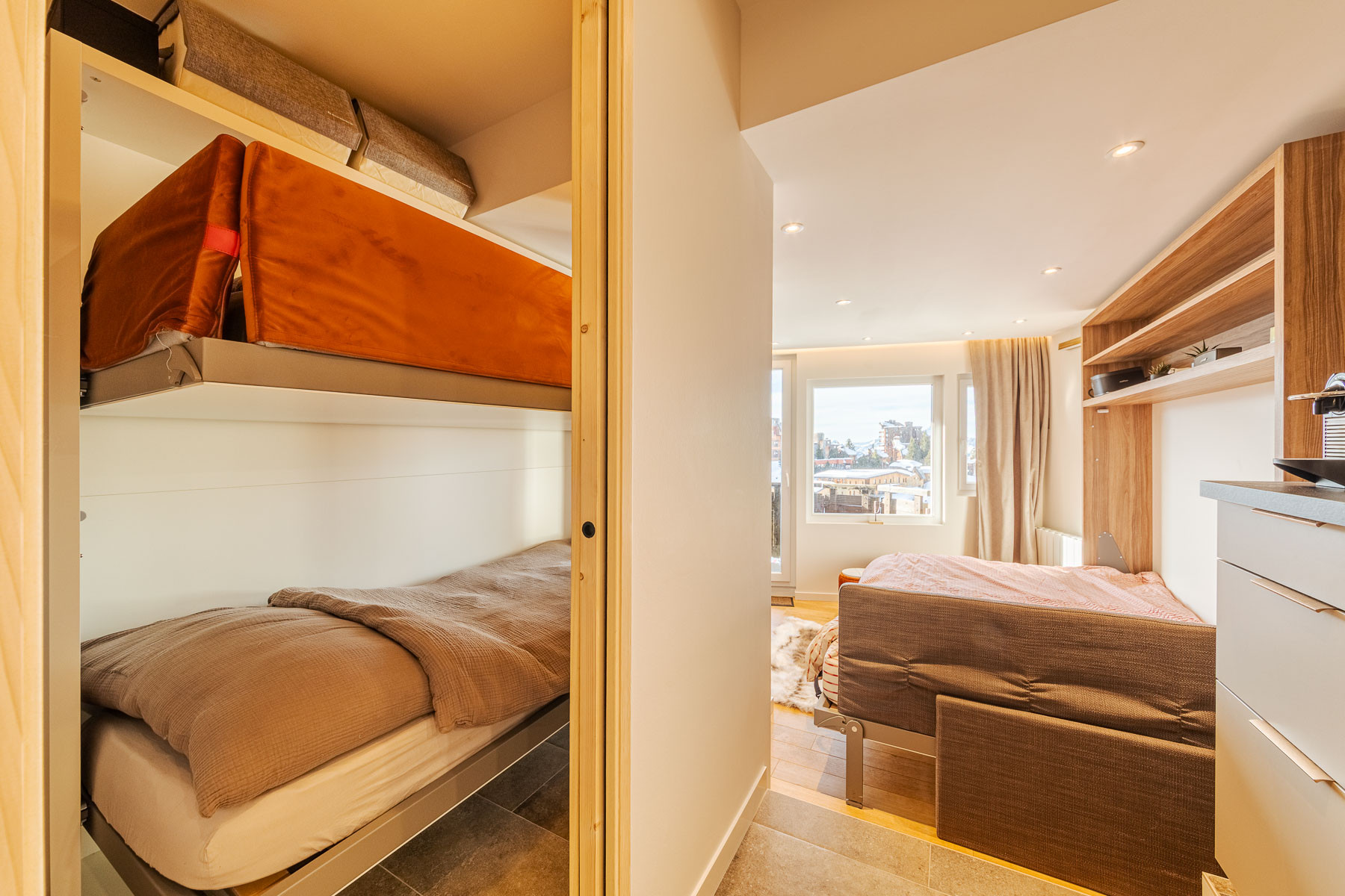 - Entrance hall with sleeping area equipped with bunk beds (double bed at the bottom and single bed at the top)