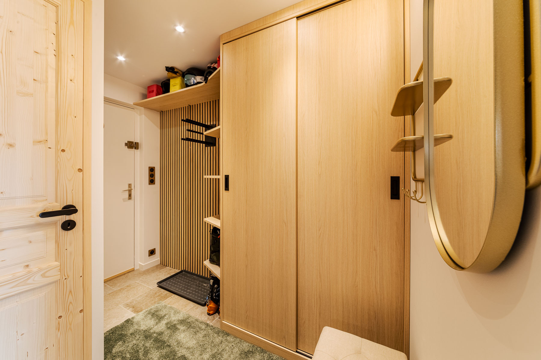 - The entrance has a storage space for skis and belongings.